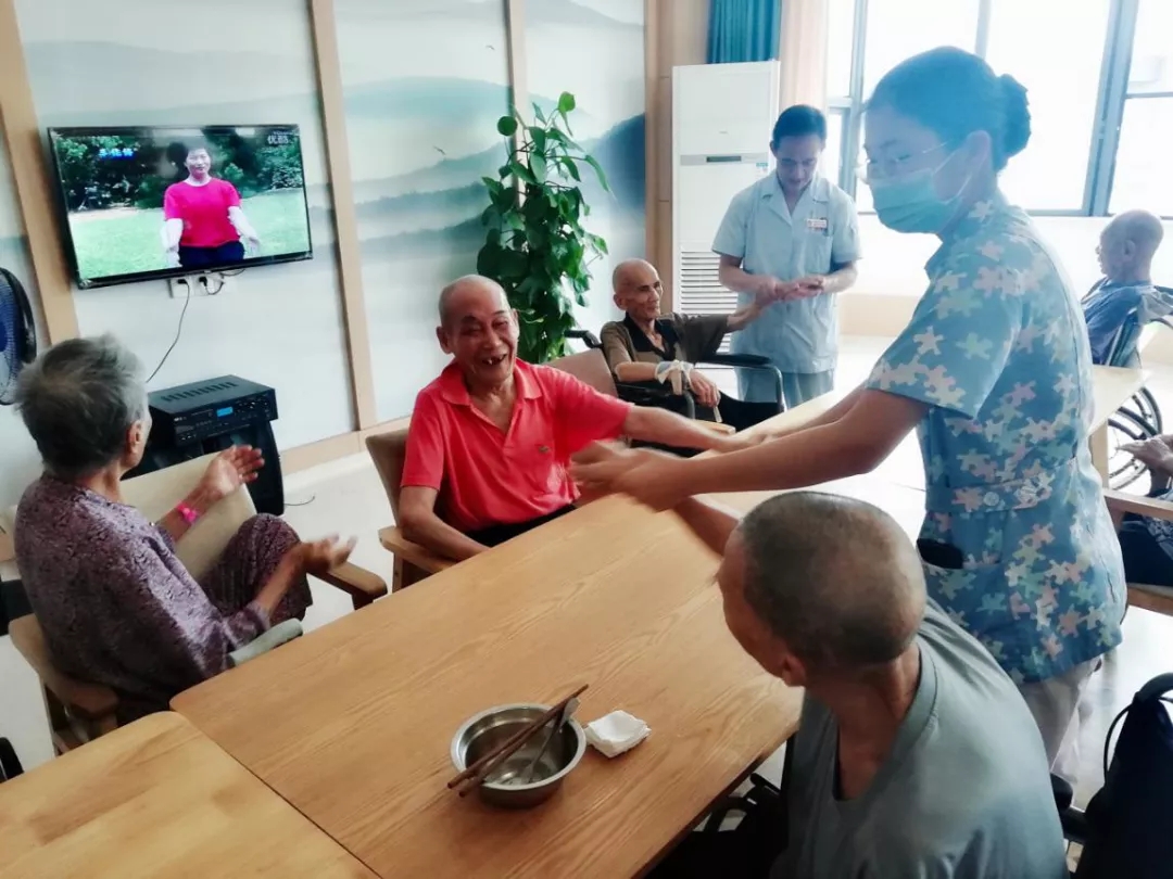 对部分长者来说,看着电视或者跟着我们的工作人员一起做还是比较有难度的。因为部分老人的眼睛已经没有年轻的视力,部分老人的手也不太灵活,这就是需要我们工作人员的辅助,在他们手把手的教学下,争取让全部长者都能一起动起来,整个活动厅都充满了青春与夕阳活力。