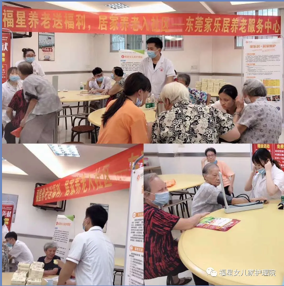“福星医养集团东莞区域—东莞福星女儿家护理院与东莞家乐居养老服务中心于6月23号下午,在东莞市莞城街道市桥社区举办一场关于敬老、爱老、助老的义诊关怀活动,我院派出1名医生、2名护士、3名社工、1名康复师为社区长者提供了免费的义诊包括量血压、测体温、关怀慰问等服务。