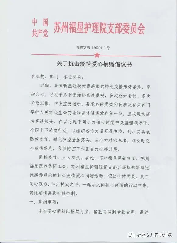 但防控疫情,人人有责。由集团、集团工会、苏州福星护理院党支部发起,开展抗疫爱心捐赠活动,全体党员、员工同心戮力,一起加入抗疫行动,确保疫情得到有效控制,筹集的款项指定通过慈善总会转到武汉疫区。