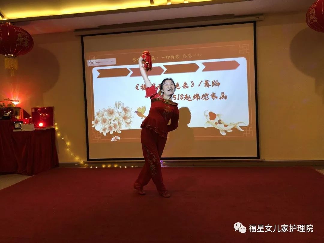 我们除了喜庆和热情的舞蹈,还有护理员田阿姨、杨阿姨带来的【今生的唯一】和家属的【福门开好运来】