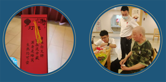 在猜灯谜时,好多老人们拿不准答案抓耳牢骚,护理院员工们见状立刻耐心地帮助老人解答谜题,看着赢得的小礼物,老人们开心地和年轻人笑在一起。