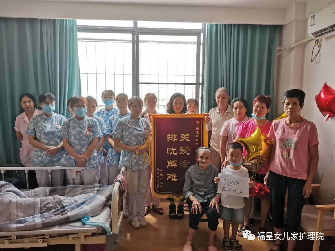 2020年8月15日,李奶奶迎来了100岁大寿,我们东莞福星女儿家各个部门一起到房间里为李奶奶过生日。(家属还不忘为我们赠送一面锦旗)