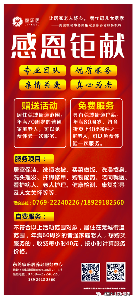 东莞家乐居养老服务中心,旨在让居家老人舒心,替忙碌儿女尽孝。为老服务,服务东莞,为每一位居家老人带去服务,做城市养老综合服务商。