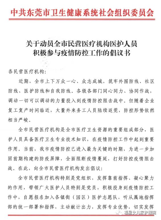 近期,中共东莞市卫生健康系统社会组织委员会发出《关于动员全市民营医疗机构医护人员积极参与疫情防控工作的倡议书》,我院立即响应号召,争先报名,随时待命,积极履行社会责任,脱岗支援抗击疫情第一线。