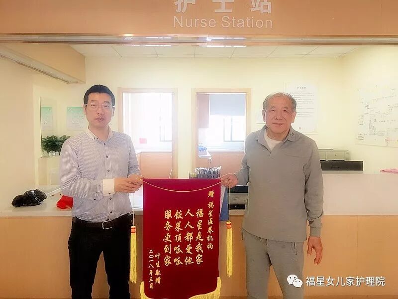 几天后,叶老先生非常有心地送来一面锦旗,写着:“福星是我家,人人都爱他,饭菜顶呱呱,服务更到家。”简短20个字,总结及肯定了我院的工作。