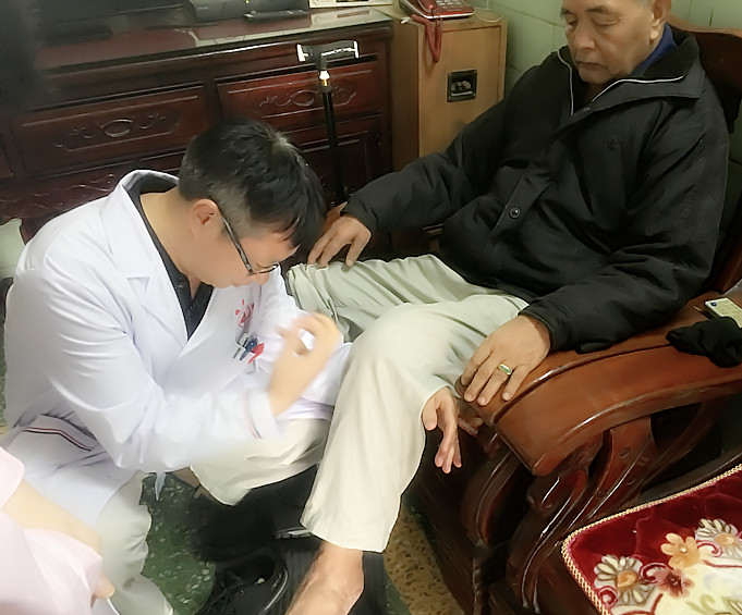 家住万江区庆丰旧街九巷的周爷爷,今年80岁,因为痛风导致脚痛,七八年前还脑出血过,目前手脚会经常抖动,疑似帕金森综合征。我院医护人员给老人检查了身体,指导爷爷做了一些简单的功能锻炼,希望爷爷能够经常保持适当锻炼,防止脑出血后遗症进行性加重。